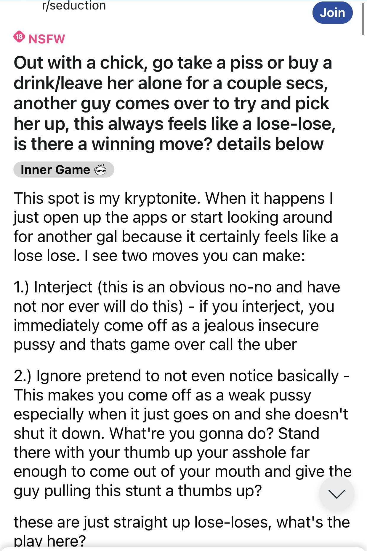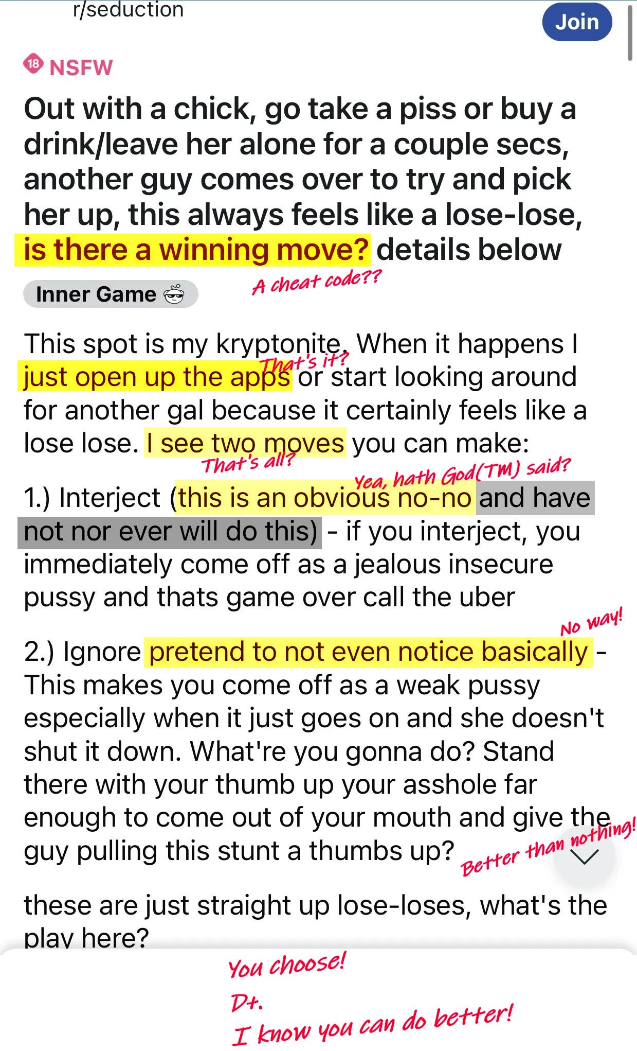 The poster of that thread instantly gave me the ick in his replies. Imagine the horror show for that poor girl watching him try to keep his composure and smoothly roll out charming seduction techniques from his internet-provided utility belt. She sighs, “I was just trying to get laid.”